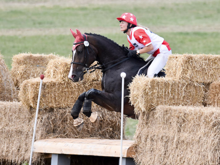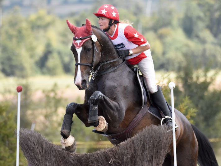 Mit Fantasia de Lully hatten wir eine andere Zielsetzung. Ohne Risiken eingehen zu müssen, eine vertrauensvolle und fehlerfreie Geländerunde zu absolvieren. Dies gelang recht gut, wenn auch die Springkurve an den Hindernissen noch nicht immer ideal verläuft. Was nicht weiter verwundert, wurde sie  doch die letzten 4 Jahre mehrheitlich als Springpferd eingesetzt.